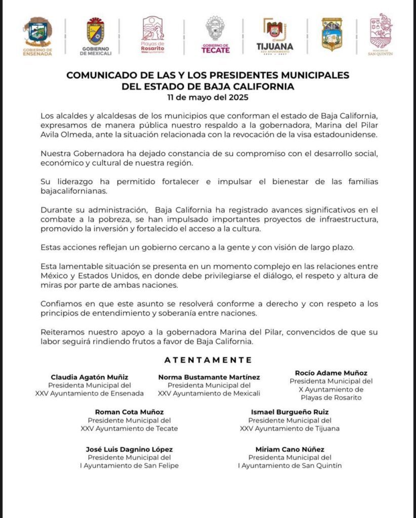 Los siete alcaldes y alcaldesas que conforman los municipios del estado de Baja California expresaron este 11 de mayo su respaldo público a la gobernadora Marina del Pilar Ávila Olmeda, luego de que se diera a conocer que le fue revocada su visa de turista por parte del gobierno de Estados Unidos.