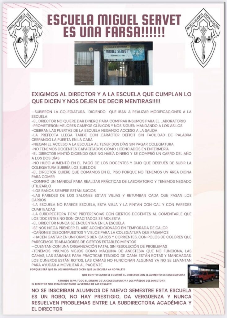 Los alumnos señalan que las instalaciones están en condiciones deplorables: baños en mal estado, paredes deterioradas y equipos médicos obsoletos que afectan su formación. Sin embargo, lo que más ha indignado a la comunidad estudiantil es que, mientras la escuela se cae a pedazos, el director ha sido visto con un auto nuevo, argumentando que no hay presupuesto para mejoras ni para aumentar los sueldos de los maestros.