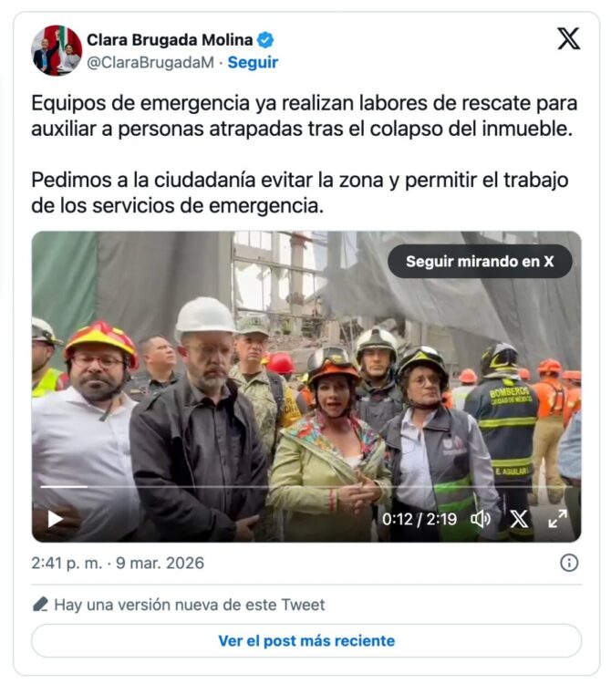 Más tarde arribó la jefa de Gobierno de la capital, Clara Brugada, quien explicó que el inmueble había sido dañado durante el sismo de 2017 y formaba parte de los edificios considerados de alto riesgo, por lo que se realizaban trabajos de demolición.
