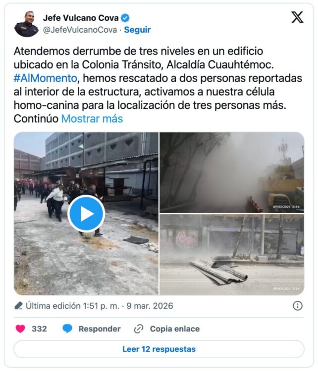 El jefe del Heroico Cuerpo de Bomberos de la Ciudad de México, Juan Manuel Pérez Cova, conocido como “Jefe Vulcano”, informó que dos personas fueron rescatadas del interior de la estructura colapsada. Al mismo tiempo, los equipos de emergencia continúan con las labores de búsqueda para localizar a otras personas que podrían permanecer atrapadas.