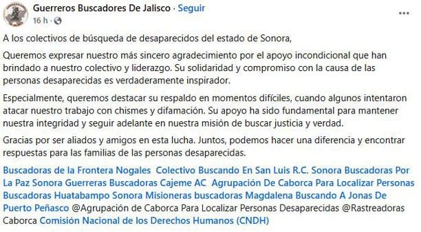 El comunicado está respaldado por colectivos como Buscadoras por la Paz Sonora, Buscando en San Luis R.C., Guerreras Buscadoras de Guaymas y Empalme, Buscadoras Huatabampo Sonora, Agrupación de Caborca para Localizar Personas Desaparecidas AC, Buscadoras Magdalena Misioneras, Rastreadoras de Caborca, Buscando a Jonas de Puerto Peñasco y Buscadoras de la Frontera Nogales.