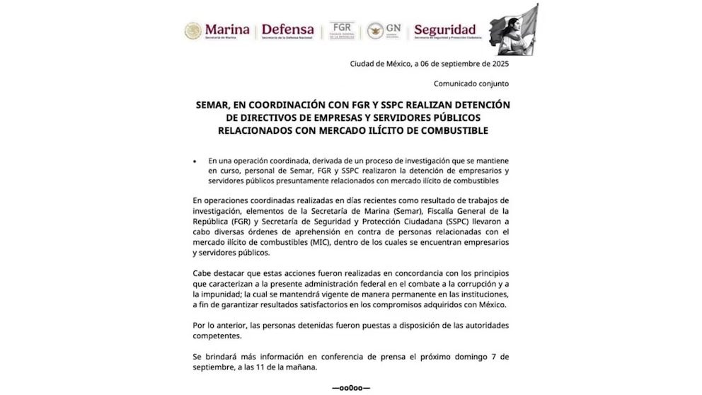 Finalmente, Harfuch anunció que el domingo 7 de septiembre a las 11:00 horas se llevará a cabo una conferencia de prensa para ampliar detalles sobre la operación, los resultados obtenidos y los próximos pasos en la estrategia contra el mercado ilícito de combustibles