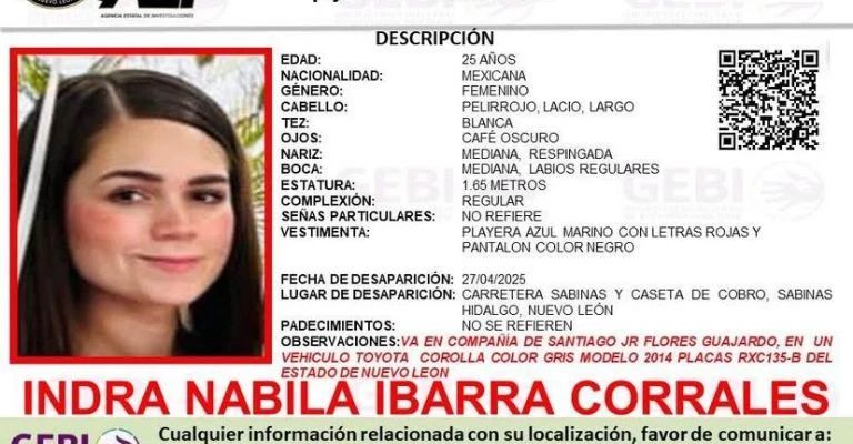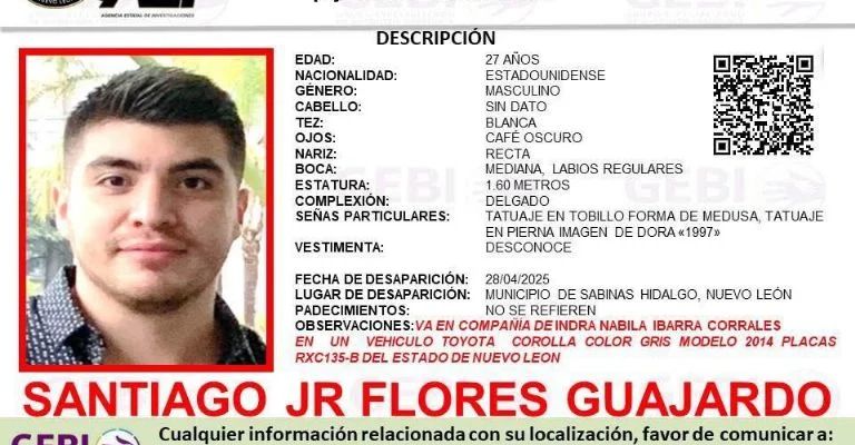 La Fiscalía de Nuevo León emitió una alerta de búsqueda tras la desaparición de Santiago Jr Flores Guajardo, ciudadano estadounidense de 27 años, y de Indra Nabila Ibarra Corrales, mexicana de 25 años, quienes fueron vistos por última vez el domingo 27 de abril mientras circulaban por la carretera Monterrey-Laredo.