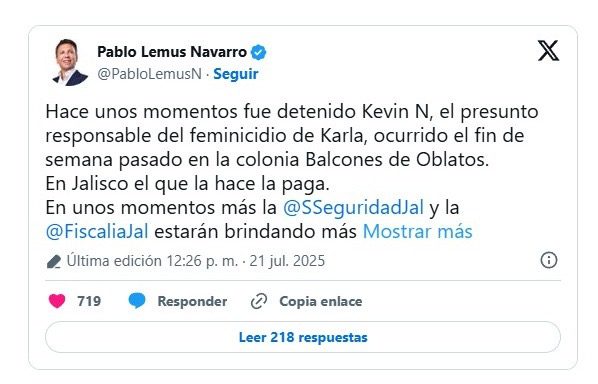 Kevin “N”, señalado como el presunto responsable del feminicidio de Karla Bañuelos, fue detenido este lunes por autoridades de Jalisco, confirmó el gobernador Pablo Lemus a través de sus redes sociales…
