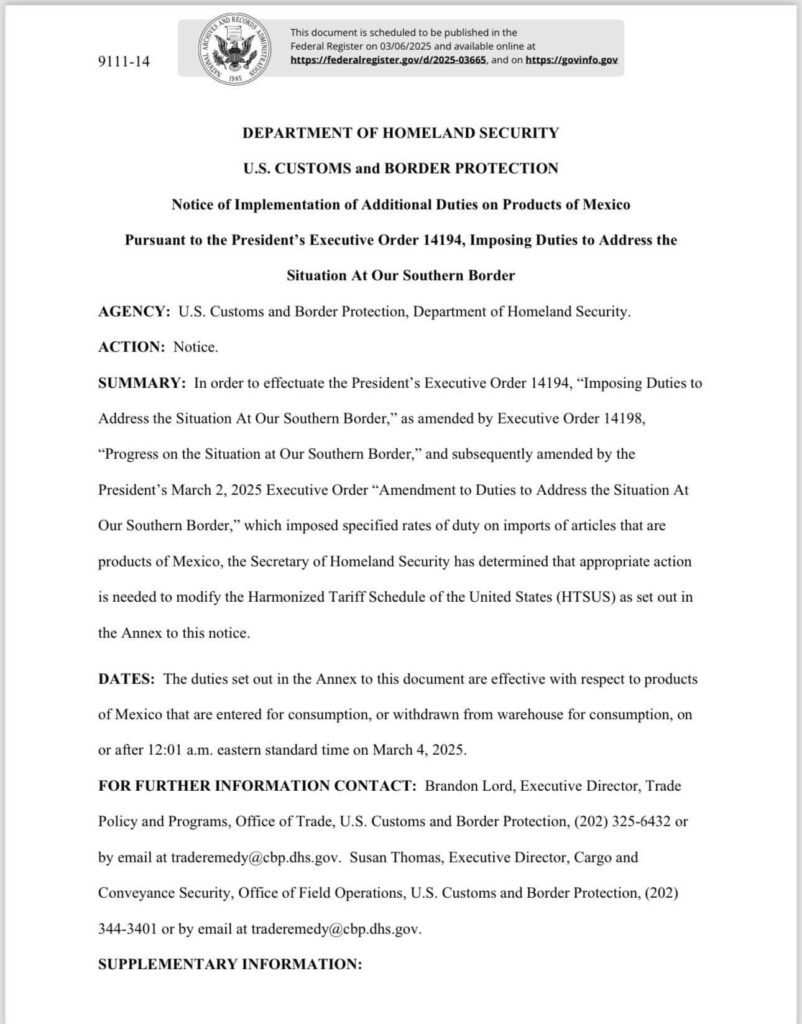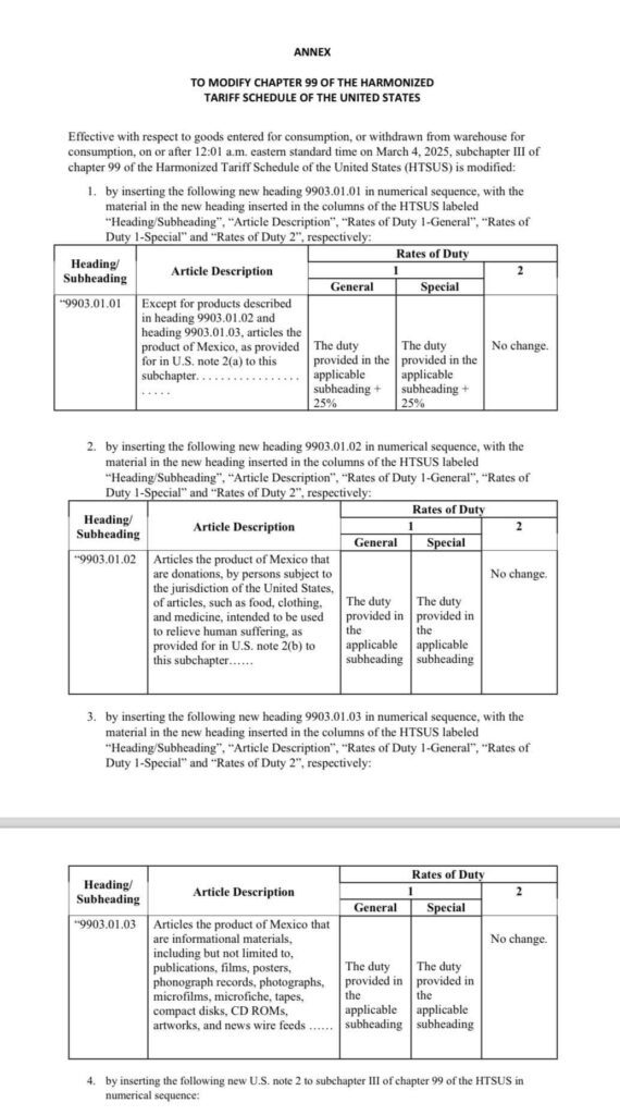 El presidente de Estados Unidos, Donald Trump, ha materializado sus advertencias al imponer un arancel del 25% a las importaciones provenientes de México, medida que entrará en vigor este martes 4 de marzo de 2025. La decisión, publicada en el Federal Register, se justifica como una estrategia para combatir el tráfico de drogas y la inmigración ilegal, problemas que la administración Trump atribuye a una supuesta falta de acción por parte de México.
