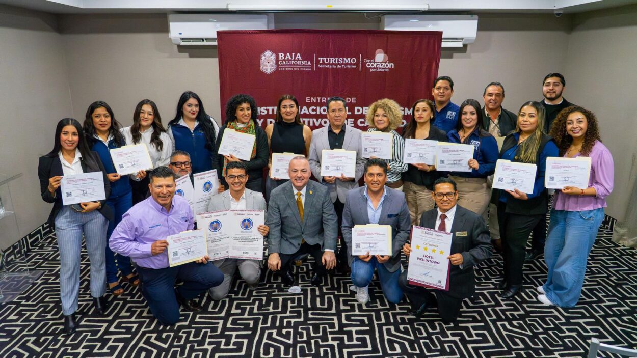 El secretario de Turismo de Baja California, Miguel Ángel Badiola Montaño, encabezó la entrega de 14 Registros Nacionales de Turismo (RNT), 4 Distintivos H y 1 Constancia de Clasificación Hotelera a prestadores de servicios turísticos de la entidad.