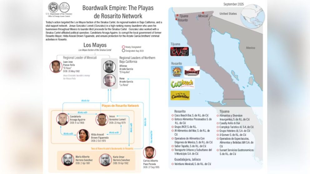 La Oficina de Control de Activos Extranjeros (OFAC) detalló que Brown Figueredo habría sostenido una relación cercana con Candelario Arceaga, alias “El Cande”, lo que le permitió influir en nombramientos dentro del Ayuntamiento de Rosarito.