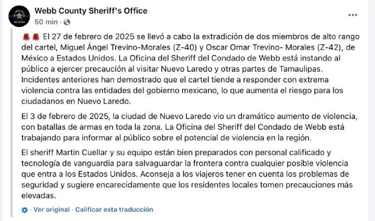 • Oficina del Sheriff del condado de Webb emite advertencia ante posibles represalias del Cártel del Noreste.