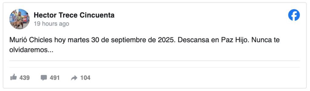 “Solo les informo que alguien muy malo, alguien de un corazón muy malo, envenenó al Chicles. Chicles ha fallecido”, expresó.