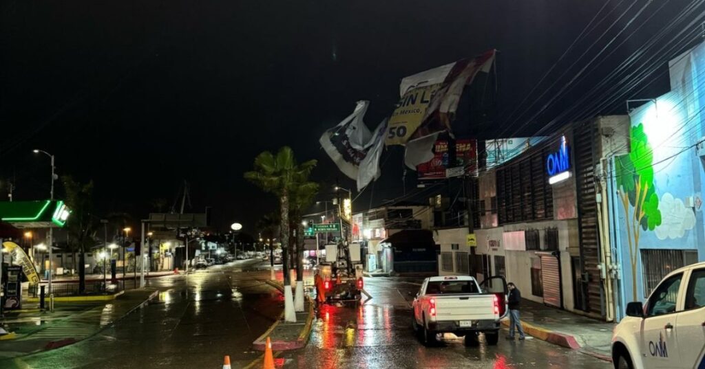 Las intensas lluvias y ráfagas de viento registradas desde la noche del jueves en Ensenada han provocado múltiples afectaciones en la ciudad, entre ellas la caída de árboles, ramas, cables sobre la vía pública, semáforos apagados y anuncios publicitarios en riesgo de colapsar.
