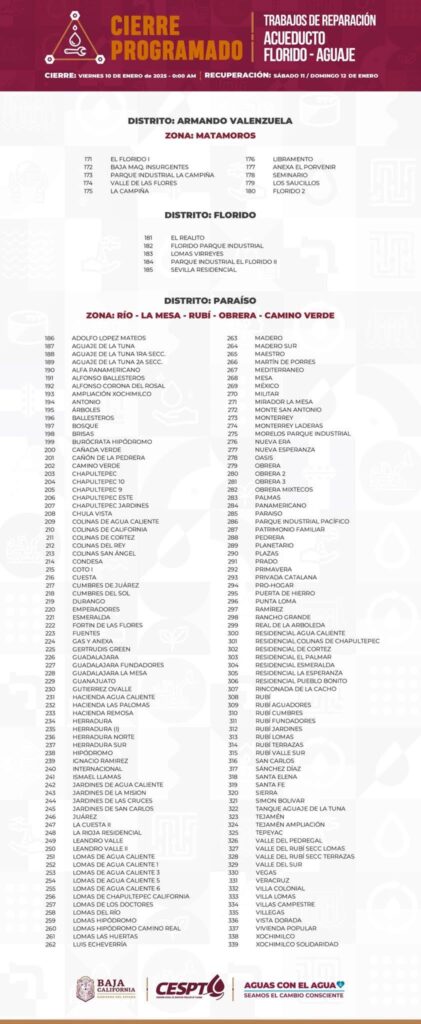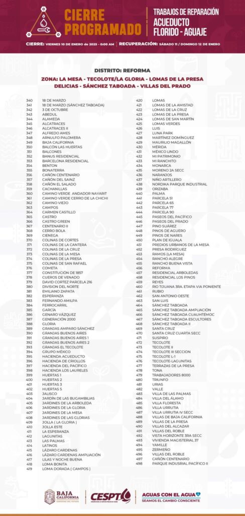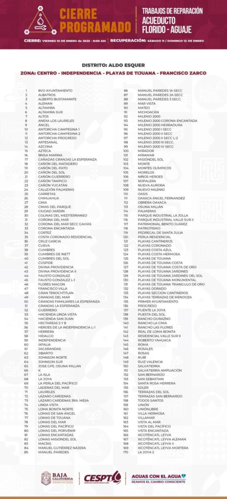 La Comisión Estatal de Servicios Públicos de Tijuana (CESPT) informó sobre un corte de agua programado que afectará a 632 colonias de Tijuana y Playas de Rosarito durante 62 horas, debido a trabajos urgentes en el Acueducto Florido-Aguaje.