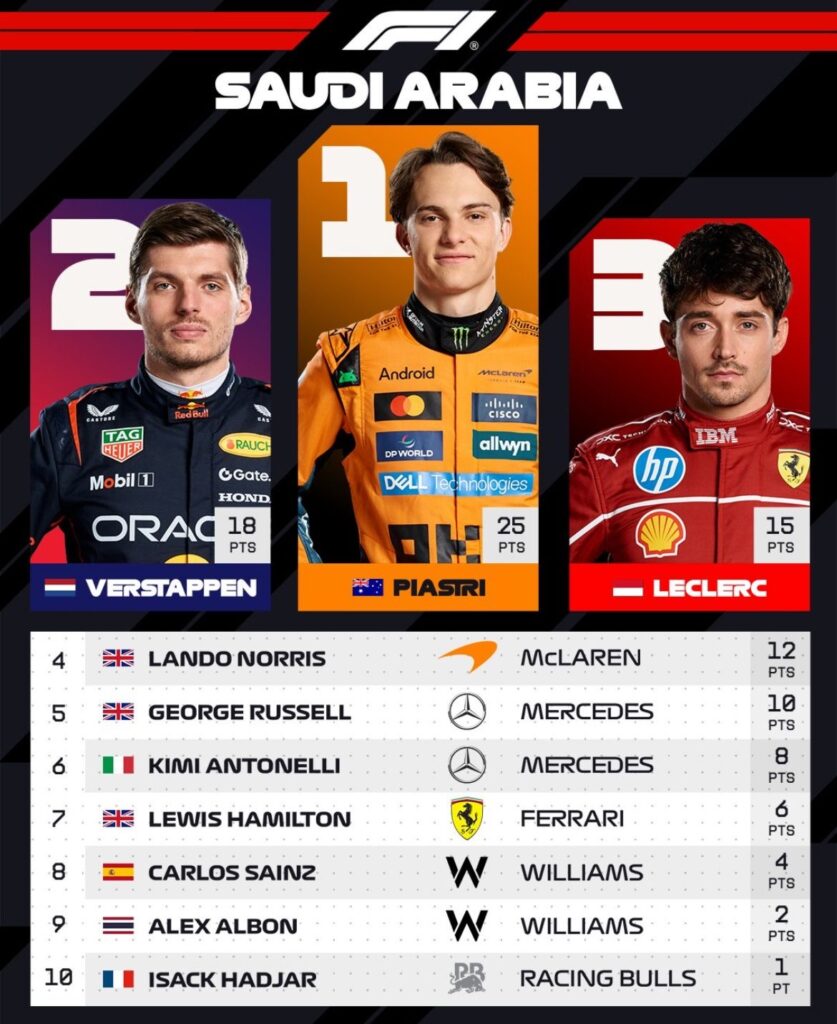 No obstante, Lando es Lando y poco aguantó arriba e incluso coqueteó con un castigo por una salida imprudente en pits. Entonces fue cuando Piastri, quien ha levantado la mano en la campaña, se adueño de la carrera y firmó su tercera victoria para colocarse como mandón en el Mundial de Pilotos 2025.