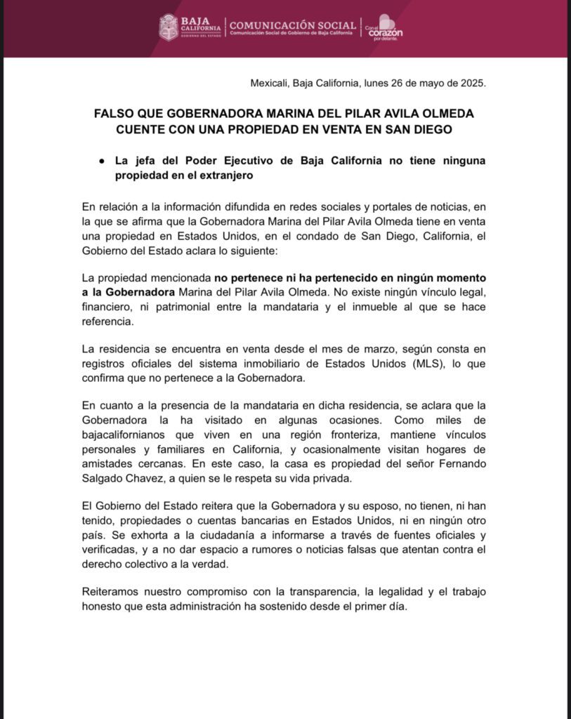 El Gobierno de Baja California desmintió este lunes que la gobernadora Marina del Pilar Ávila Olmeda tenga en venta una propiedad en el condado de San Diego, California, como lo han difundido recientemente algunos portales de noticias y redes sociales.