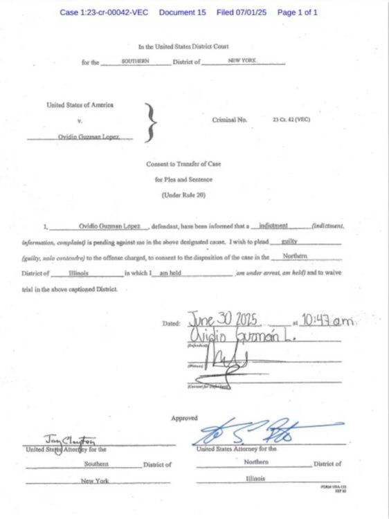 Según documentos oficiales de la Corte Federal del Distrito Sur de Nueva York, fechados el 30 de junio de 2025, Guzmán López expresó su intención de declararse culpable del delito que se le imputa, además de aceptar que su caso sea trasladado al Distrito Norte de Illinois, donde actualmente se encuentra detenido. En el documento también renuncia a su derecho a juicio en el distrito de origen.
