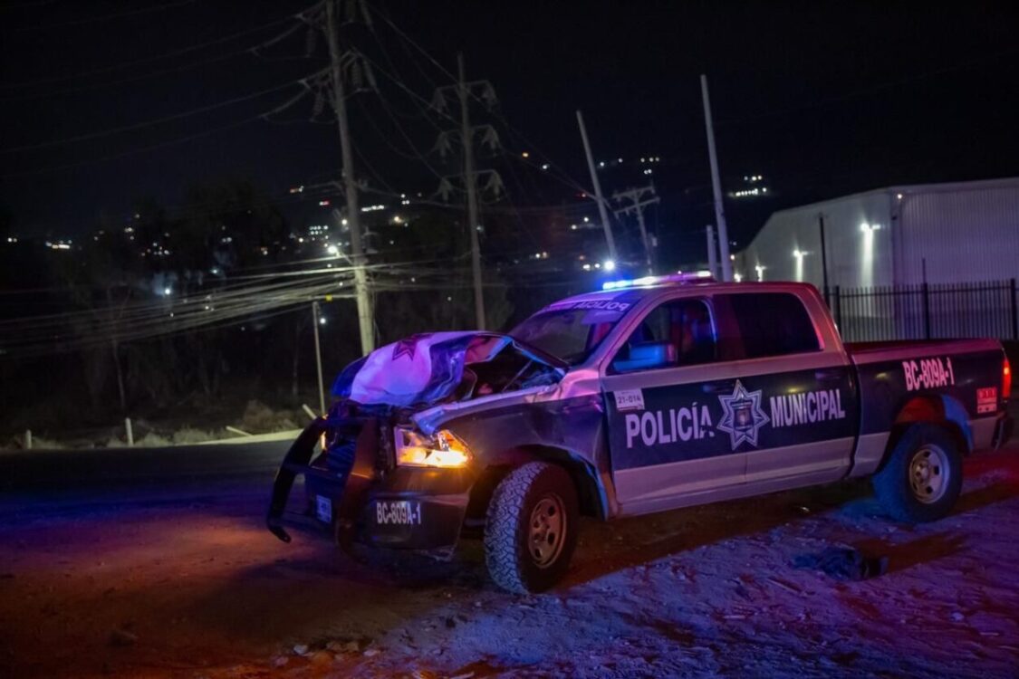 La noche del martes, una patrulla de la Policía Municipal, identificada con el número BC-809A-1, colisionó contra un burro que se cruzó repentinamente en el Bulevar 2000, a la altura de la colonia Valle Bonito.