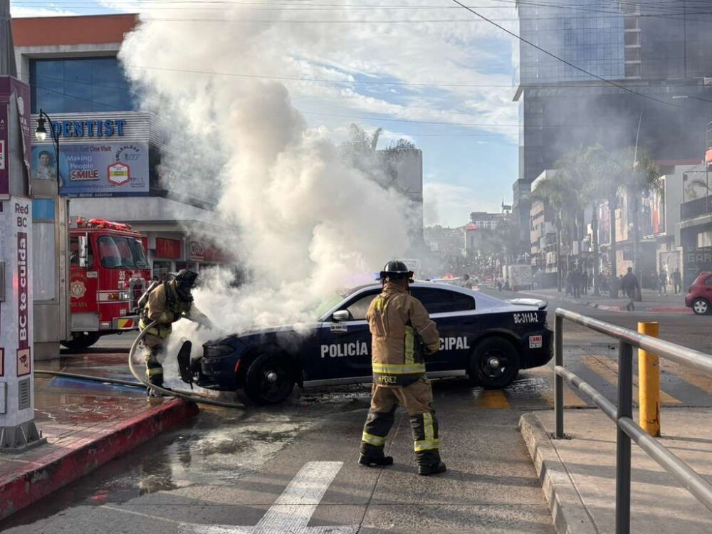 Una patrulla de la Policía Municipal se incendió la tarde de este martes cuando circulaba sobre la avenida Revolución, en la esquina con calle Tercera, en la Zona Centro de Tijuana.