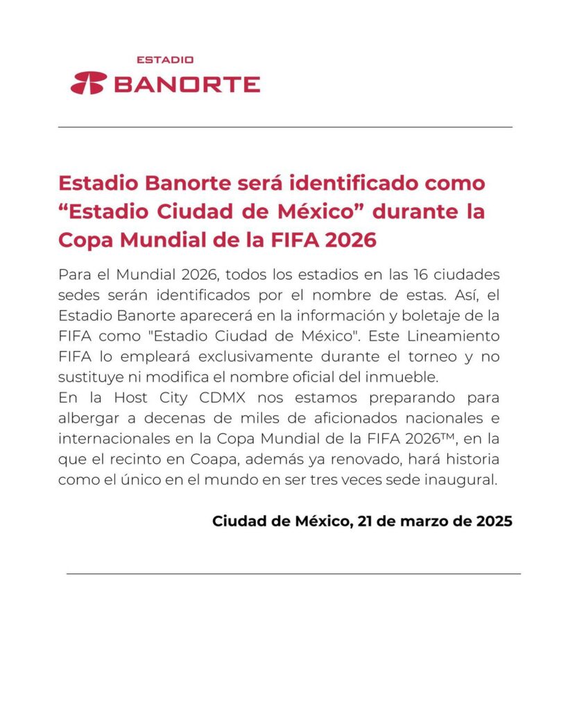 “Este Lineamiento FIFA lo empleará exclusivamente durante el torneo y no sustituye ni modifica el nombre oficial del inmueble”, se lee en otra parte del comunicado.