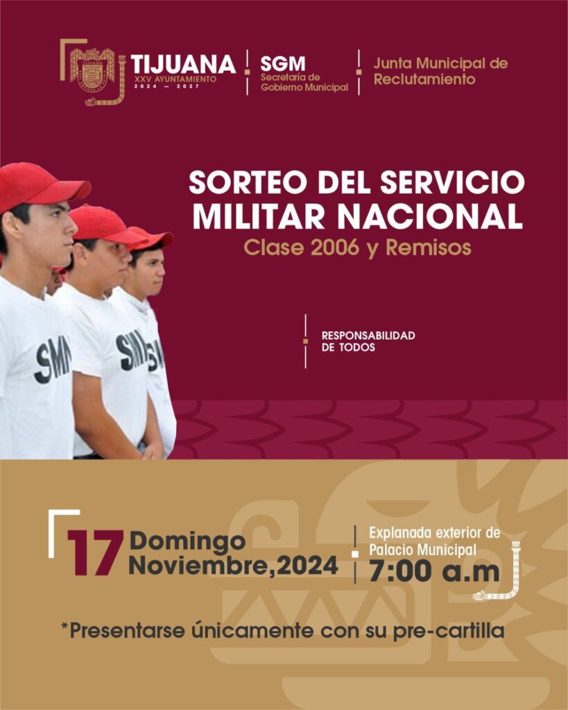 Tijuana, Baja California, 15 de noviembre de 2024.- El XXV Ayuntamiento que encabeza el Alcalde de Tijuana, Ismael Burgueño Ruiz, a través de la Junta Municipal de Reclutamiento, informa que, el próximo domingo 17 de noviembre, a las 7:00 horas, en la explanada de Palacio Municipal se realizará el Sorteo del Servicio Militar Nacional (SMN), Clase 2006 y Remisos.