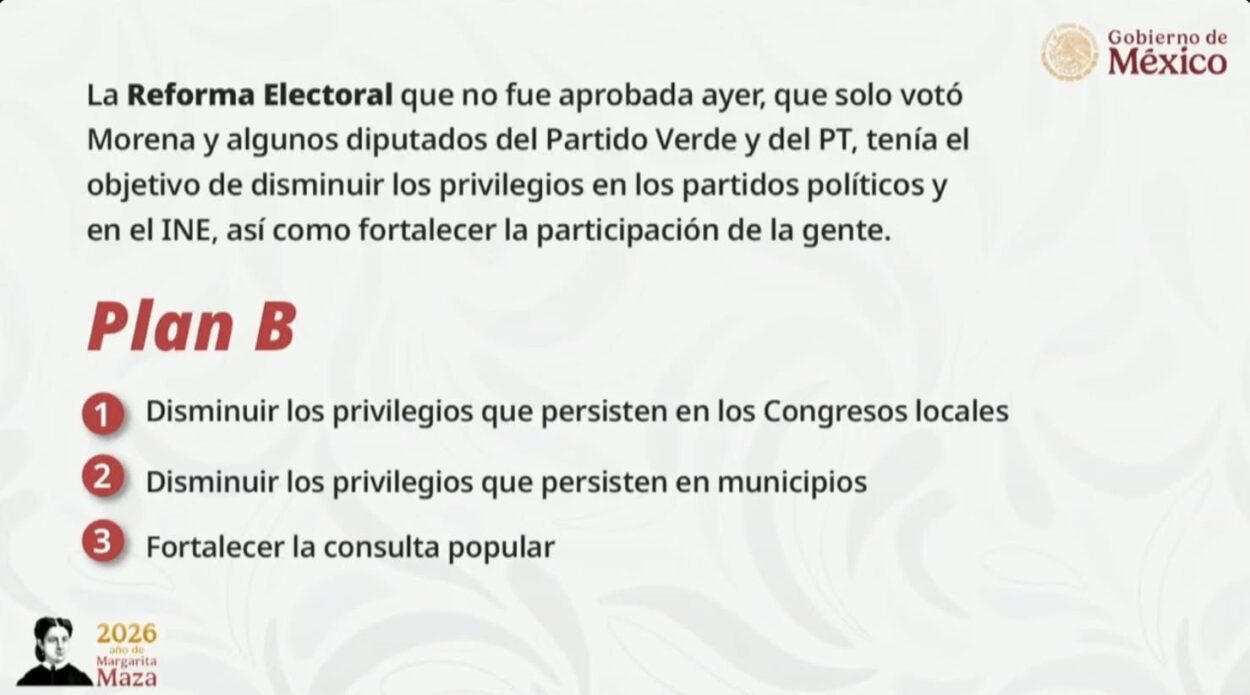Luego de que su iniciativa de reforma electoral no alcanzara la mayoría calificada en la Cámara de Diputados, la presidenta Claudia Sheinbaum anunció que su gobierno impulsará un “Plan B” legislativo enfocado en reducir gastos y privilegios en congresos locales y ayuntamientos, además de ampliar algunos mecanismos de participación ciudadana.