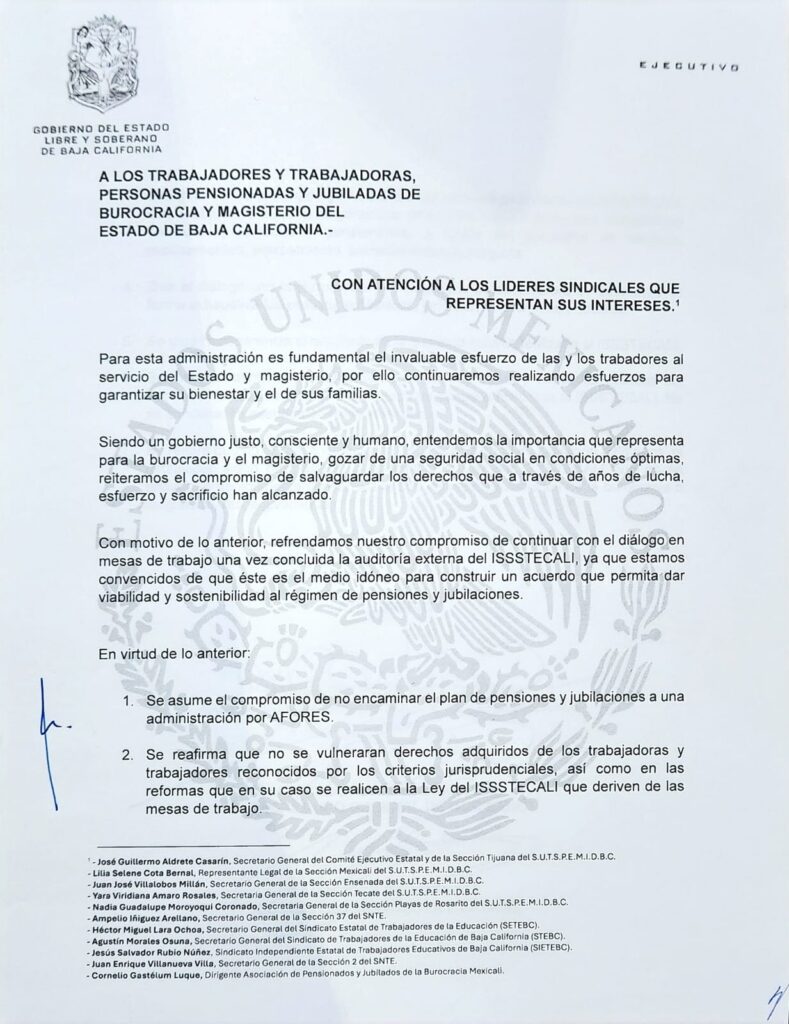MEXICALI.- Conforme a una política pública que pone en el centro a las personas, la gobernadora de Baja California, Marina del Pilar Avila Olmeda, refrendó el compromiso de seguir respetando los derechos laborales y humanos de las y los trabajadores, personas pensionadas y jubiladas de la burocracia y el magisterio, mediante la firma de un comunicado, en el marco de las acciones para el rescate y sostenibilidad del Instituto de Seguridad y Servicios Sociales de los Trabajadores del Gobierno y Municipios del Estado de Baja California (ISSSTECALI).