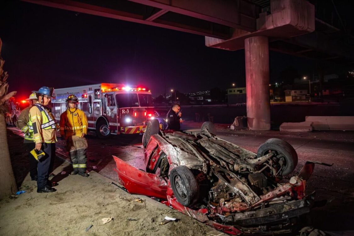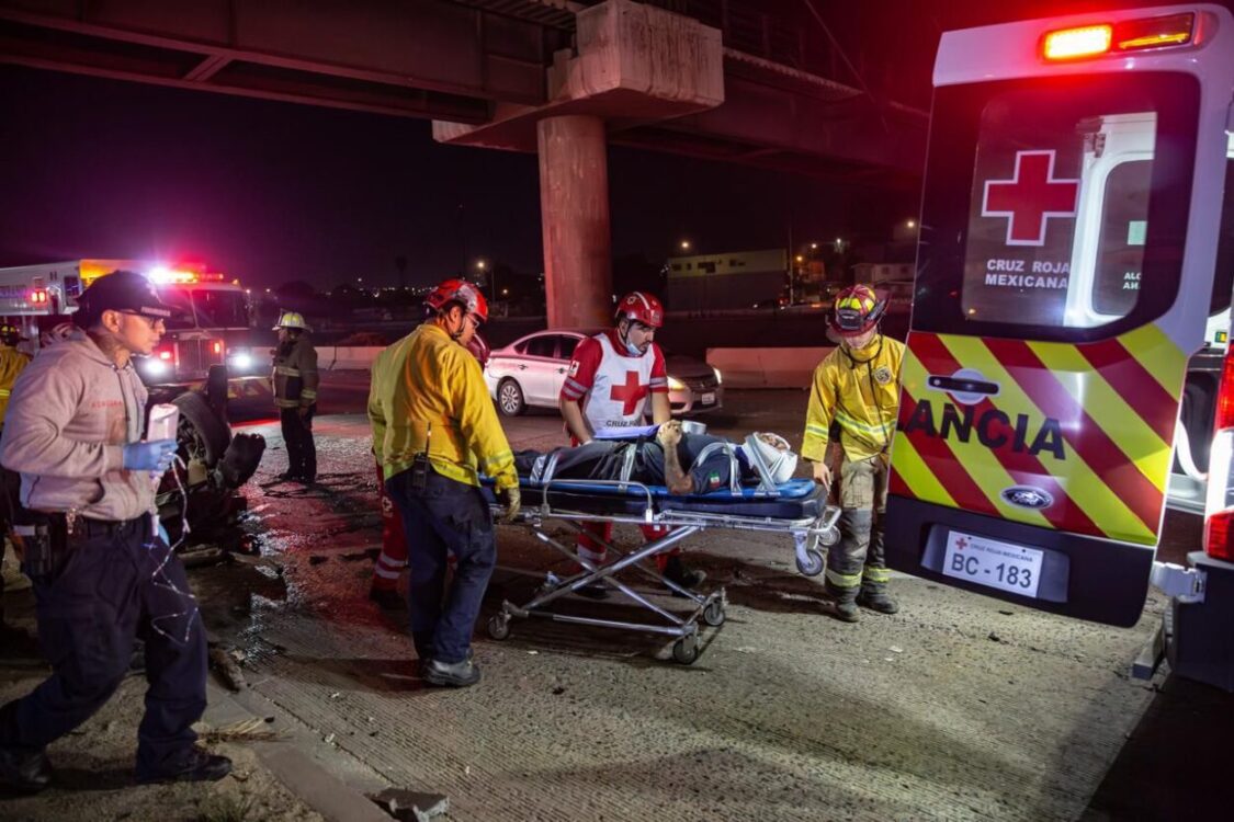 Paramédicos voluntarios de Rescate Tijuana y de la Cruz Roja acudieron al sitio y solicitaron el apoyo del Cuerpo de Bomberos, ya que el conductor había quedado prensado dentro de un sedán rojo con placas de California 6RSV836.