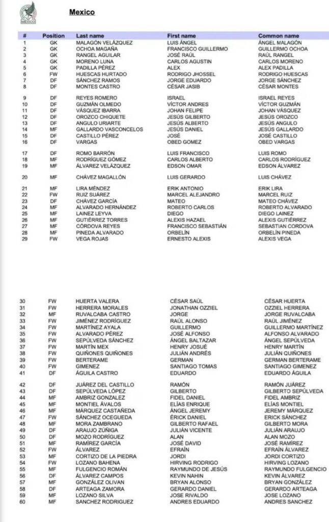 Entre los nombres que destacan en el llamado son Irving “Chuki” Lozano y Guillermo Ochoa, jugadores que fueron referentes en su etapa con el equipo azteca.