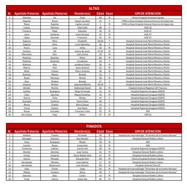 La lista también incluye a Armando Antillón Chávez, de 45 años; Daniela Barragán, de 19 años; Misael Cano Rodríguez, de 39 años; Irving Uriel Carrillo Reyes, de 20 años; Carlos Iván Contreras Salinas, de 29 años; Juan Carlos Bonilla Sánchez, de 40 años; Óscar Rubén Uriel Cortez Cisneros, de 57 años; Eduardo Noé García Morales; José Gabriel Hernández Méndez, de 17 años; Juan Antonio Hernández Betancourt; Jorge Islas Flores; Carlos Sánchez Blas, de 15 años; y Jesús José Tovar García, de 40 años.