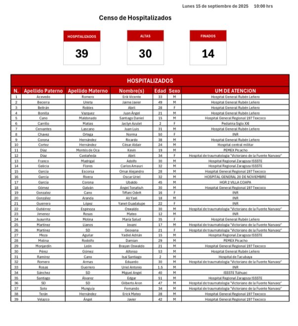 Al corte de las 10:00 horas de este lunes 15 de septiembre, la dependencia detalló que 39 personas permanecen hospitalizadas en distintos centros médicos de la capital, mientras que 30 más han sido dadas de alta tras recibir atención médica.