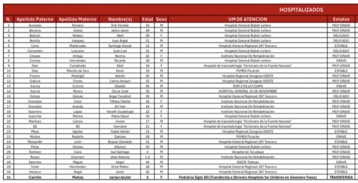 De acuerdo con el reporte de la dependencia encabezada por Nadine Gasman, aún permanecen 31 personas hospitalizadas, mientras que 33 ya fueron dadas de alta.