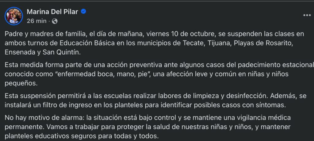 Las autoridades educativas informaron que este viernes 10 de octubre se suspenderán las clases en ambos turnos de Educación Básica en los municipios de Tecate, Tijuana, Playas de Rosarito, Ensenada y San Quintín.