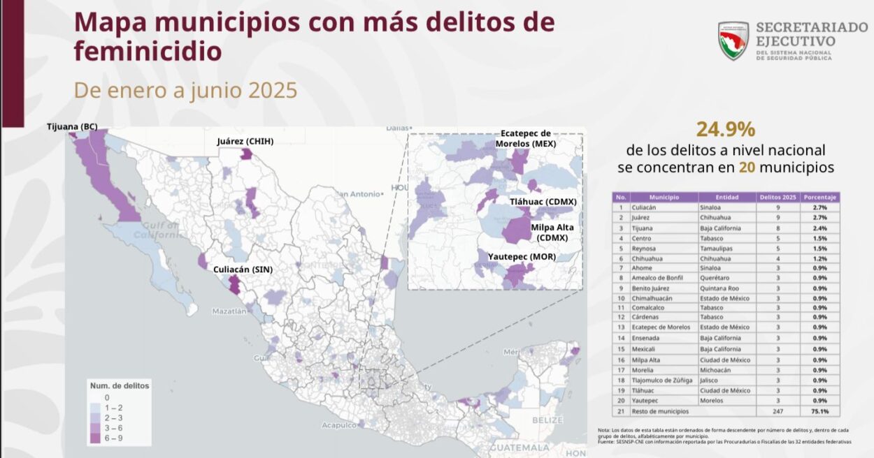 Tres municipios de Baja California aparecieron en el ranking nacional de las 20 ciudades con más carpetas por feminicidio durante el primer semestre de 2025, de acuerdo con cifras del Secretariado Ejecutivo del Sistema Nacional de Seguridad Pública (SESNSP).