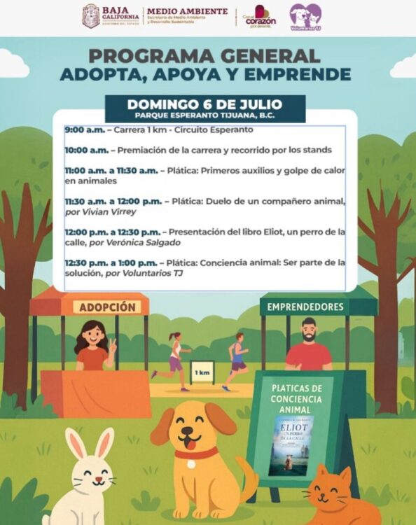 La Secretaría de Medio Ambiente y Desarrollo Sustentable (SMADS) de Baja California, en coordinación con la asociación Voluntarios TJ, convocó a la ciudadanía a participar en la feria “Adopta, emprende y apoya”, que se realizará el próximo domingo 6 de julio en el Parque Esperanto de Tijuana, a partir de las 9:00 de la mañana.