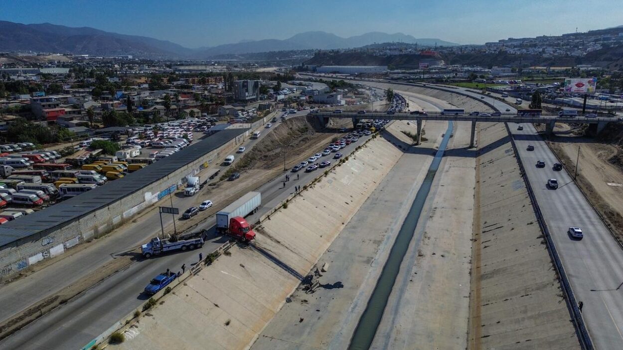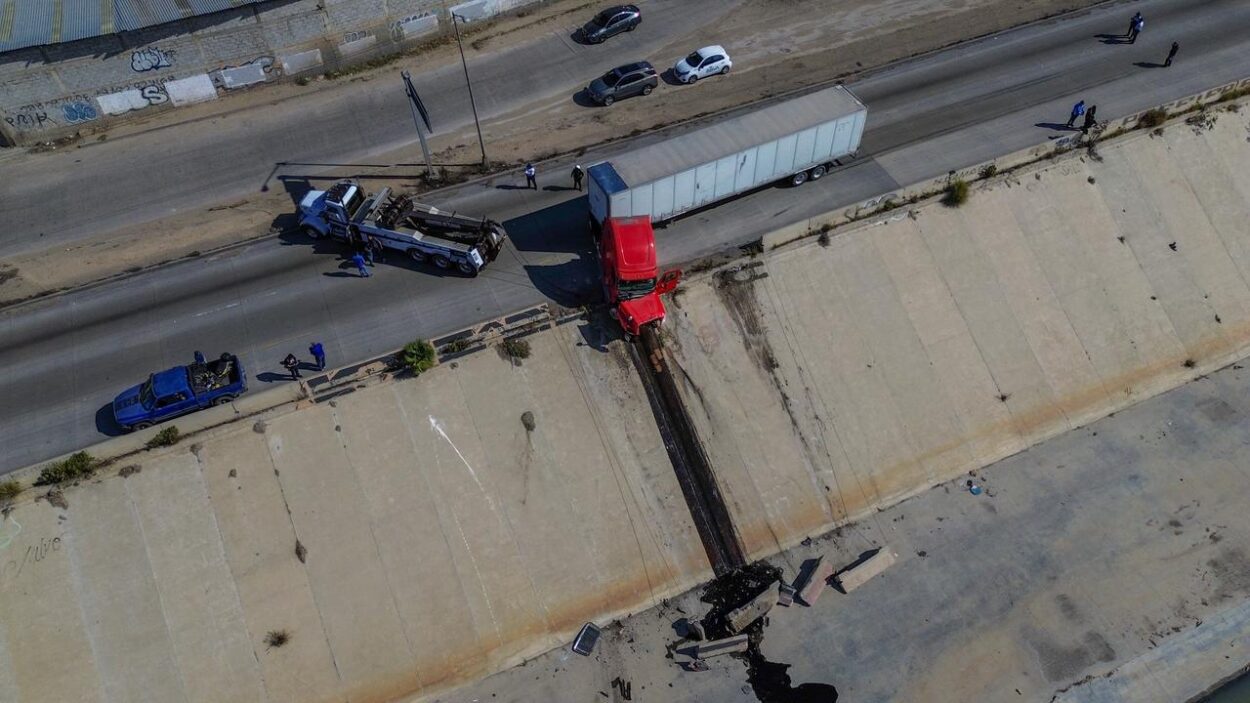La mañana de este viernes se registró un accidente en la Vía Rápida Alamar, a la altura de la colonia Murua, donde un tráiler terminó peligrosamente inclinado, a punto de caer a la canalización.