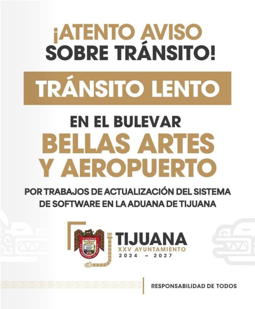Debido a la actualización del sistema de software en la Aduana de Tijuana, el tránsito vehicular se ha visto afectado en el Bulevar Bellas Artes y el Bulevar Aeropuerto, informó el Ayuntamiento de Tijuana.