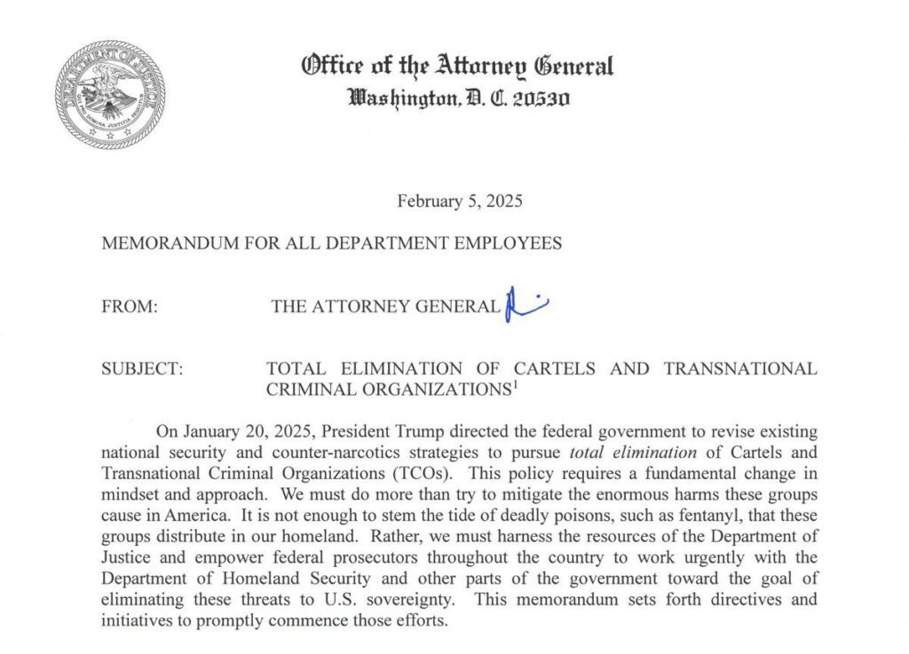 La Fiscalía General de los Estados Unidos emitió un memorando en el que ordena intensificar las acciones contra los cárteles y organizaciones criminales transnacionales, incluyendo al Cártel de Sinaloa, el Cártel de Jalisco Nueva Generación (CJNG) y el Tren de Aragua.