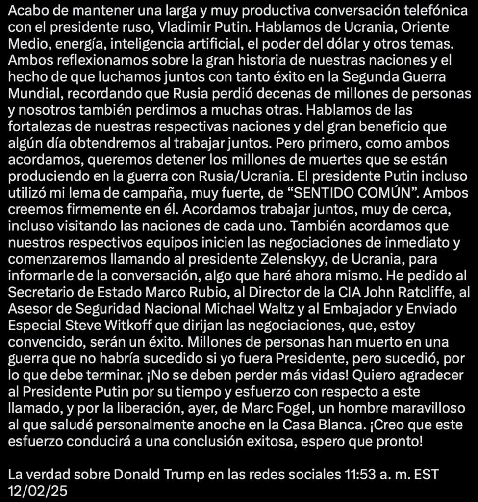 El presidente de Estados Unidos, Donald Trump, anunció que sostuvo una “larga y muy productiva” conversación telefónica con su homólogo ruso, Vladimir Putin, en la que ambos acordaron iniciar de inmediato negociaciones para poner fin al conflicto en Ucrania. Trump informó que su equipo comenzará las gestiones y que se comunicará con el presidente ucraniano, Volodymyr Zelensky, para informarle sobre el diálogo. Según detalló, la decisión se tomó tras una “larga y productiva llamada” con Putin, en la que ambos expresaron su intención de frenar la guerra.