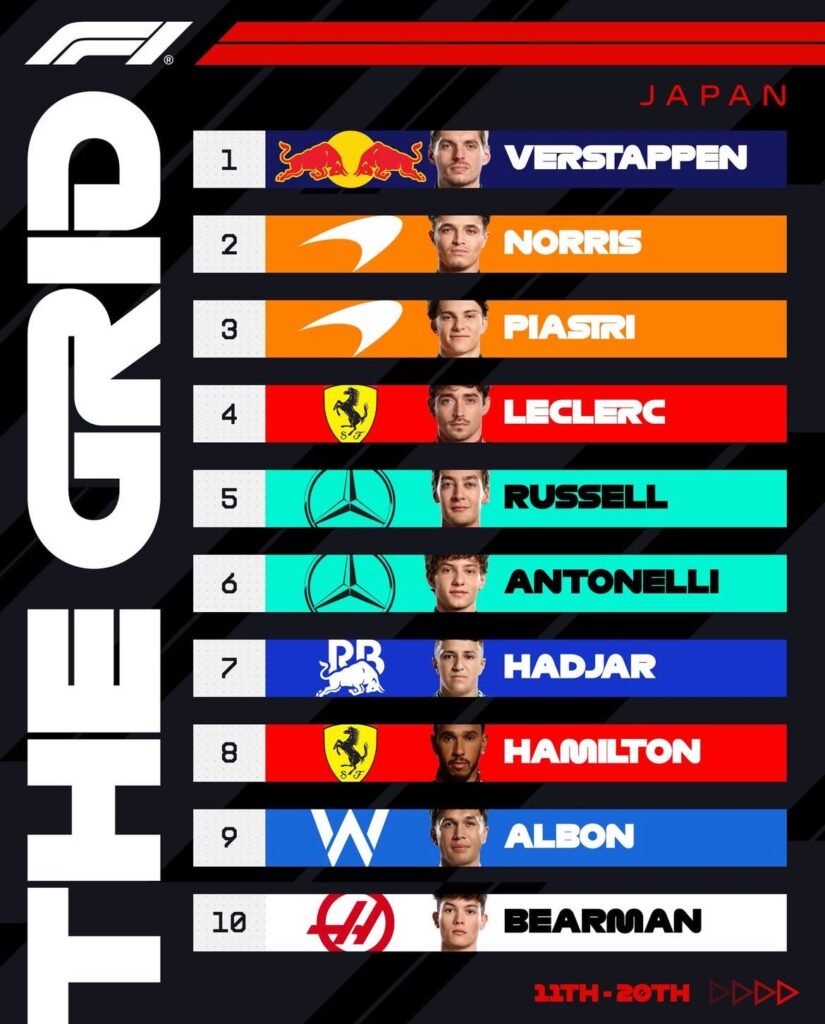 Max Verstappen obtuvo la pole position para el Gran Premio de Japón con un tiempo récord de 1m26s983, logrando desplazar a los McLaren de Lando Norris y Oscar Piastri en los momentos finales de la clasificación en Suzuka.